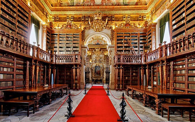 隱身於科英布拉大學古老校園中的◎喬安娜圖書館,是一座宛如夢境的巴洛克奇蹟。這座18世紀由葡萄牙國王若昂五世建造的皇家圖書館,外觀莊重低調,內部卻金碧輝煌,彷彿走入一幅藝術畫作。三層樓高的館內,雕花木書架擺滿了逾七萬本古籍,金箔裝飾閃耀其間,天花板上繪有象徵知識與信仰的濕壁畫。據說館內還飼養蝙蝠以保護書籍免受蟲蛀,增添神祕色彩。這裡不只是知識殿堂,更是時光凝結的藝術寶庫。
