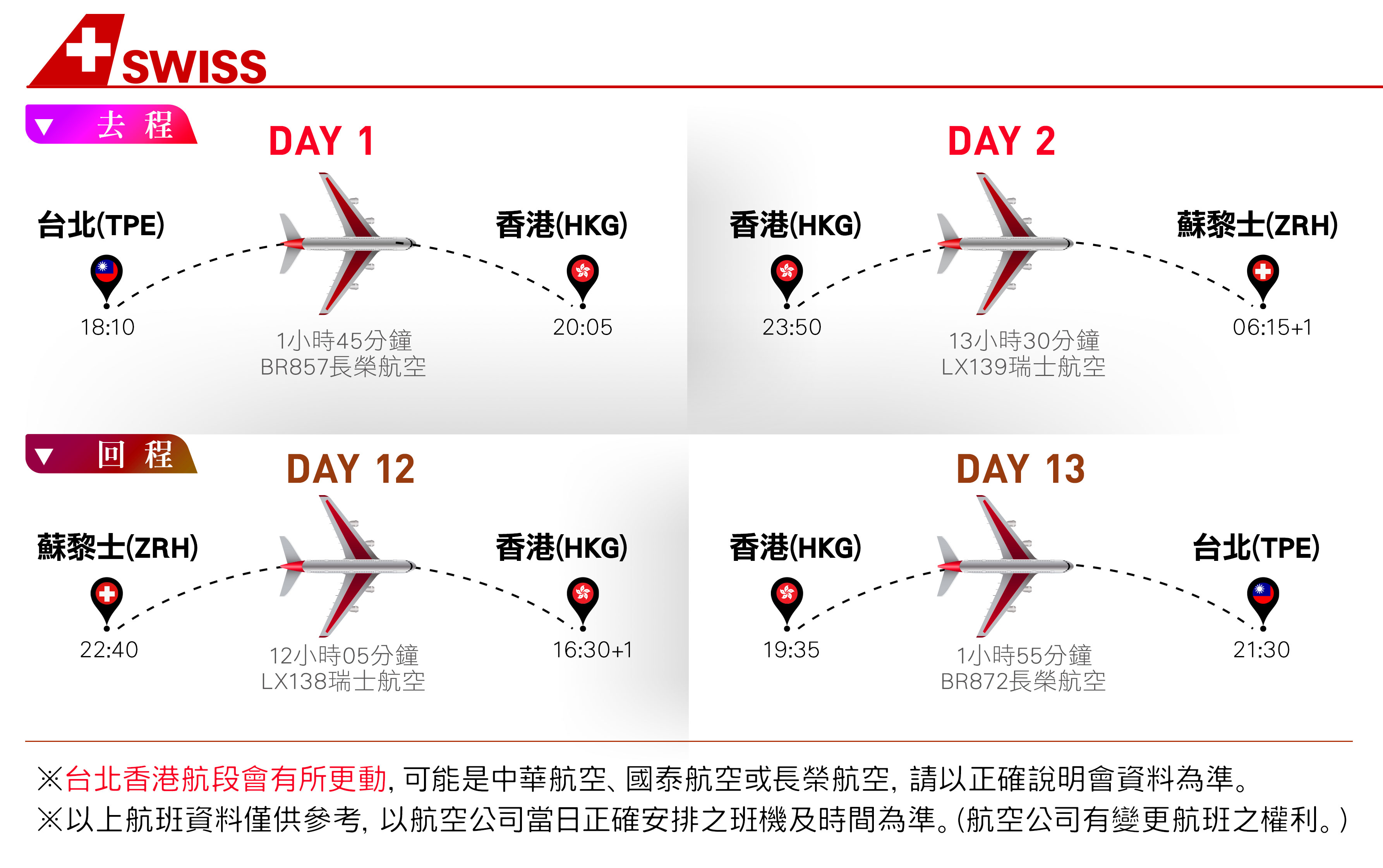 瑞治旅行社非常榮幸能夠為您服務,希望再次帶給您與眾不同的瑞士深度之旅。早餐:機上簡餐 午餐:機上簡餐飛行時間:香港→台北約1.5小時