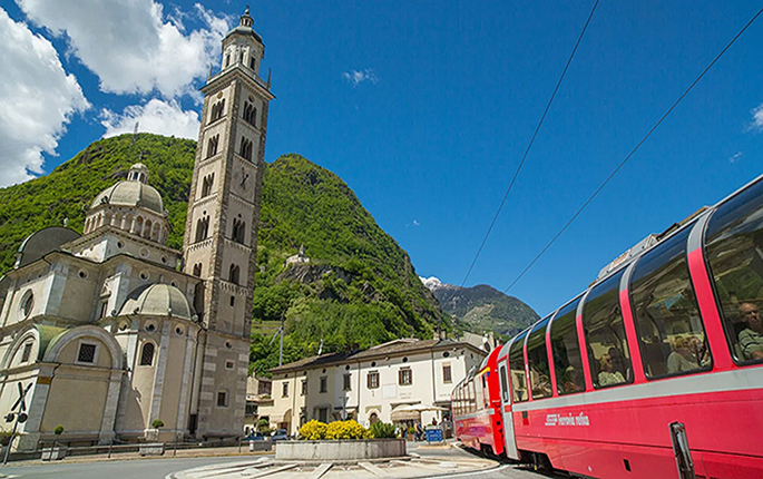 迎著香檳氣候的聖莫里茲陽光,我們將搭乘世界知名的伯尼納列車,沿途飽覽阿爾卑斯山壯麗風光,最令人難忘的路段之一,便是位於瑞士小鎮布魯西奧的360度螺旋鐵路橋。這座長 110 公尺、高 30 公尺的圓形石造鐵路,擁有九道優雅拱門,列車必須在橋上繞行一個完整大圈,才能克服高低落差。當鮮紅的伯尼納列車緩緩行駛在拱橋上,畫出一個完美弧線,與山谷田園交織成一幅絕美圖景,成為無數鐵道迷與旅人心中的夢幻場景。