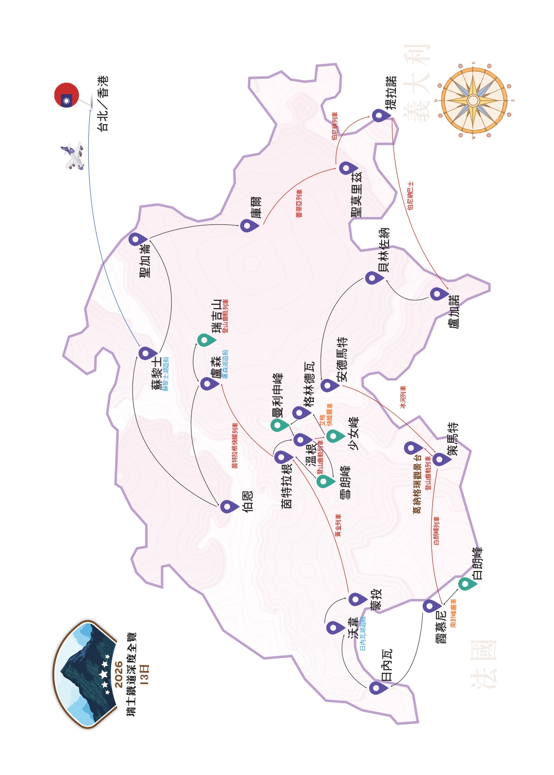 ※ 如遇冰河列車客滿或停駛,則改搭瑞士國鐵(中途需轉車),並且退費每人NTD 2,000,敬請知悉