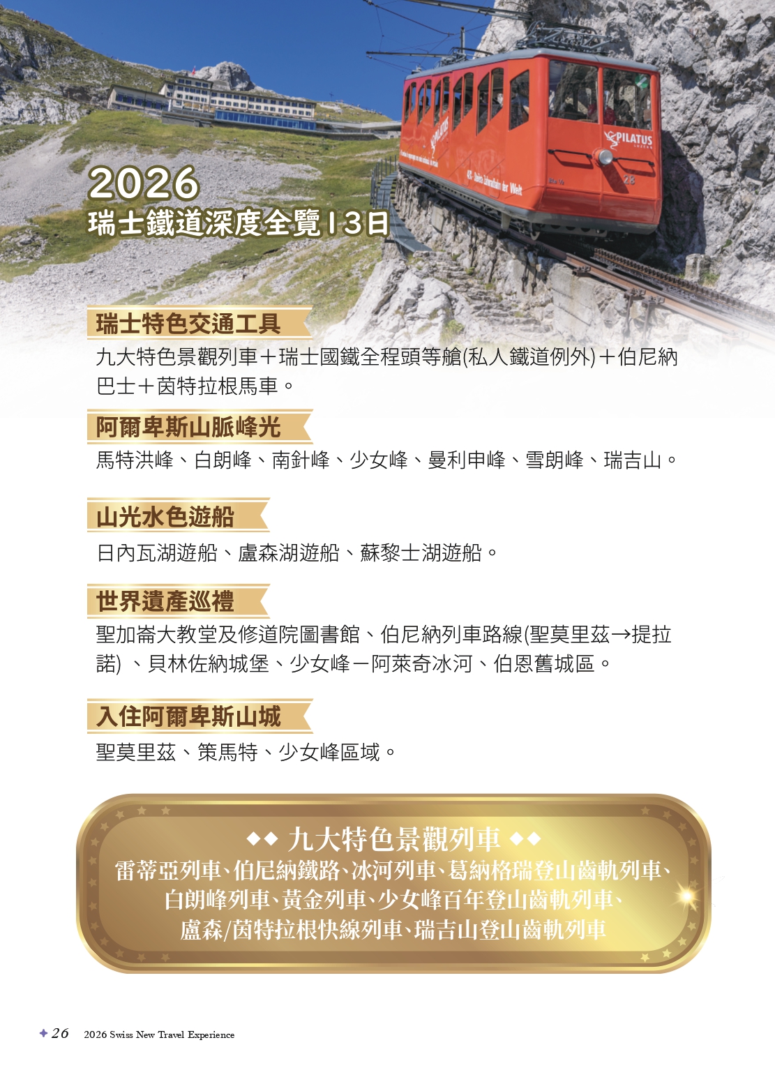 黃金列車將帶您將踏上一段穿越湖光山色、古堡村莊與阿爾卑斯群峰的浪漫旅程。這條經典鐵道路線串聯蒙投與茵特拉根,以舒適豪華的車廂和絕美景致,成為瑞士最受旅人喜愛的鐵道體驗之一。沿途經過翠綠的湖泊、起伏的山谷、巧奪天工的鐵路橋與傳統木屋小鎮,每一個轉彎都像一幅畫卷徐徐展開。